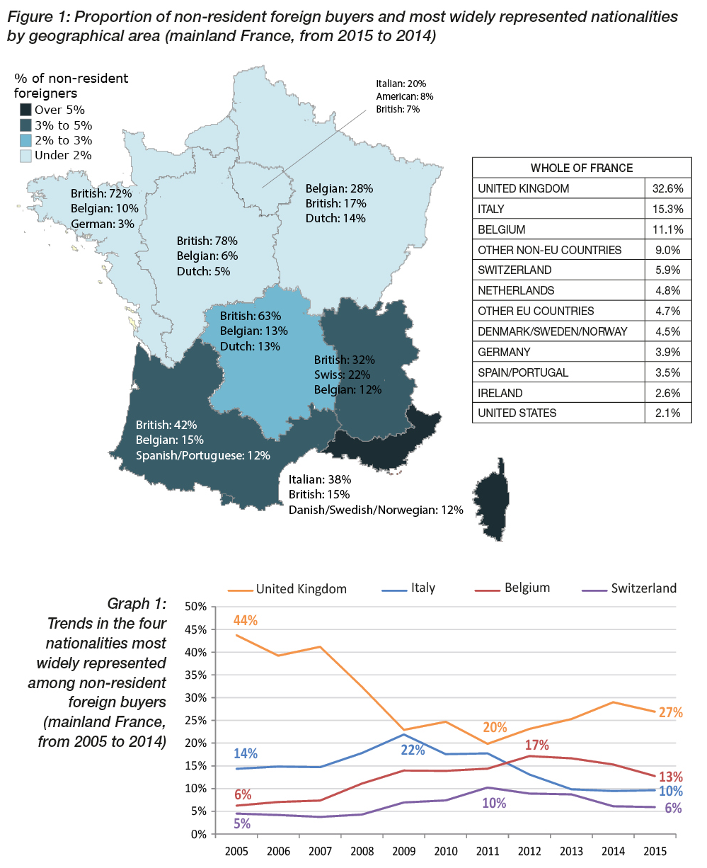 On average, between 2005-2014, Britons, Italians and Belgians together represented nearly 60% of non-resident foreign buyers; the British alone making up nearly one third of them (figure 1). In the West and Centre of France, the British significantly outnumber other nationalities, followed by the Belgians. In the North-East, the Alps and Provence/Côte d’Azur/Corsica, they rival other nationals of bordering countries, with the notable exception of the Germans. In Greater Paris, the main nationalities represented are both different and more diversified than in other regions: after the Italians, who are by far the most numerous, Americans and Britons are closely followed by Algerians (6%) and Moroccans (4%).