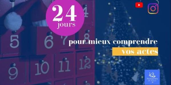 Du 1er au 24 décembre, les Notaires de France vous donnent rendez-vous sur Instagram et Youtube chaque jour pour décrypter, simplifier et mieux comprendre ce qu’il se passe lors de la signature de vos actes chez le notaire.