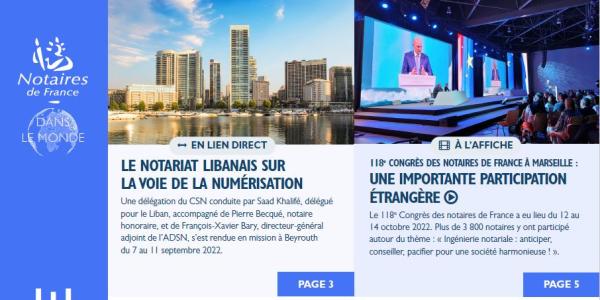 La lettre des notaires de France dans le monde de novembre 2022 traite du notariat libanais sur la voie de la numérisation, du 118è Congrès des notaires de France à Marseille, de l'intérêt du contrat de mariage en cas d'expatriation ...