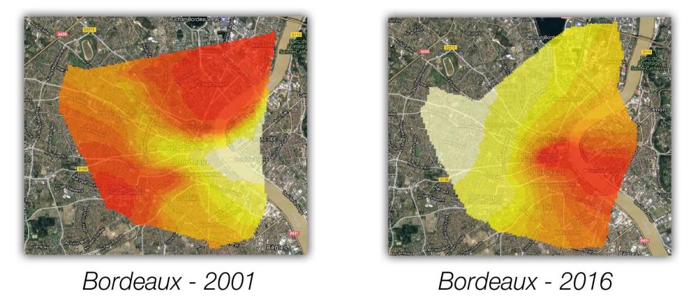 L'évolution graphique ne traduit cependant pas forcément une baisse des prix en valeur absolue dans les quartiers considérés mais indiquent les quartiers où l'on peut constater une augmentation des prix en valeur relative, d'un quartier à un autre. Ainsi si un bien a conservé la même valeur au cours des 15 ans de l'étude, alors que cette valeur a augmenté et dépassé ce niveau dans les autres quartiers, il apparaîtra en plus clair sur le graphique.