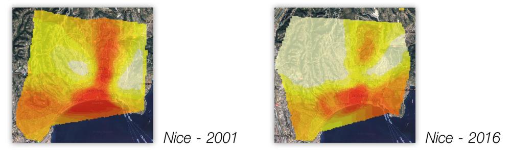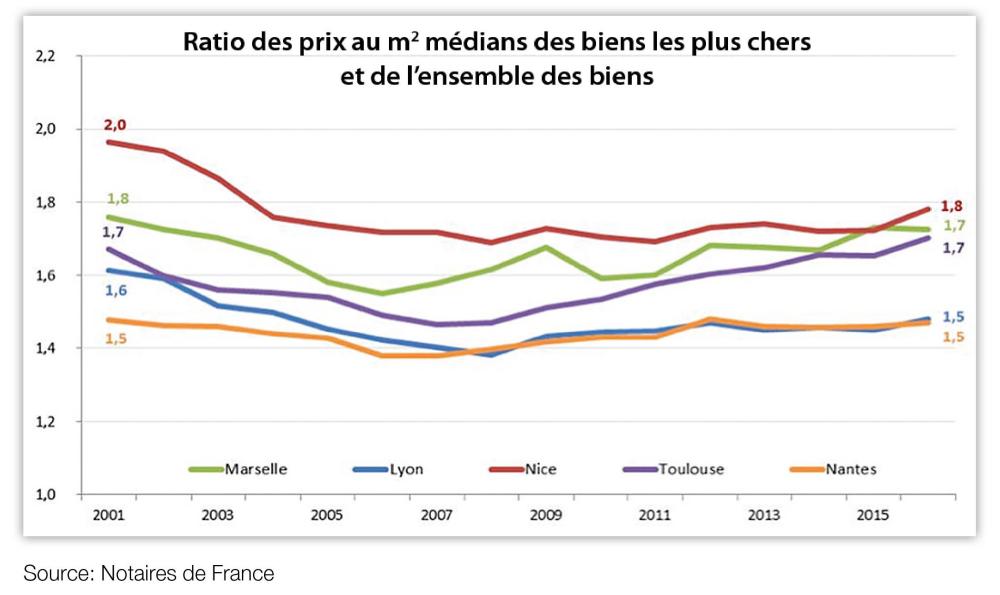A Nice, sur une durée de 15 ans, on constate que la concentration des biens les plus chers se resserre sur la bande littorale, se concentrant désormais sur la portion de la Promenade des Anglais comprise entre le Negresco et le Marché Saleya, l'hyper centre-ville et le quartier du port, le Mont Boron et le Col de Villefranche.